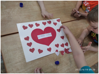 членов семей воспитанников, ромашка с загадками, красные бумажные сердечки,